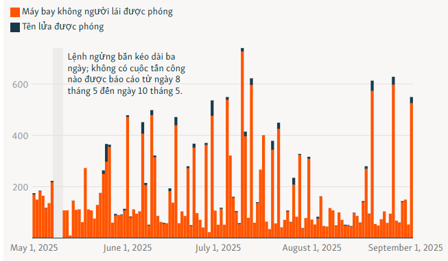 Các cuộc tấn công bằng máy bay không người lái đã tăng đột biến vào năm 2025, với hơn 4.000 vụ được ghi nhận vào tháng 5, 5.000 vụ vào tháng 6, hơn 6.000 vụ vào tháng 7 và gần 3.800 vụ vào tháng 8. Máy bay không người lái được phóngTên lửa được phóng200400600May 1, 2025June 1, 2025July 1, 2025August 1, 2025September 1, 2025