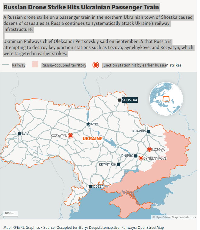Một máy bay không người lái của Nga đã đâm vào một đoàn tàu chở khách, gây ra số thương vong chưa xác định trong cuộc tấn công mới nhất nhằm vào mục tiêu dân sự trong cuộc xâm lược Ukraine đang diễn ra của Điện Kremlin.