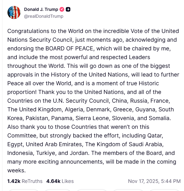 Xin chúc mừng Thế giới về cuộc bỏ phiếu đáng kinh ngạc của Hội đồng Bảo an Liên Hiệp Quốc, chỉ vài phút trước, ghi nhận và tán thành HỘI ĐỒNG HÒA BÌNH, do tôi làm chủ tịch, và bao gồm các Nhà lãnh đạo quyền lực và được kính trọng nhất trên toàn thế giới.