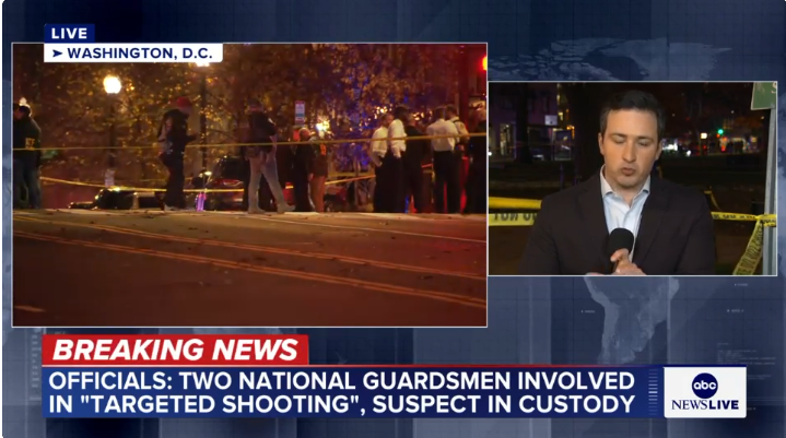ABC News Live Một người đàn ông không rõ danh tính mặc quân phục nằm trên cáng bên trong xe cứu thương, ngày 26 tháng 11 năm 2025, tại trung tâm thành phố Washington, DC Hai binh sĩ Vệ binh Quốc gia đã bị bắn cách Nhà Trắng vài dãy nhà, theo cơ quan thực thi pháp luật.