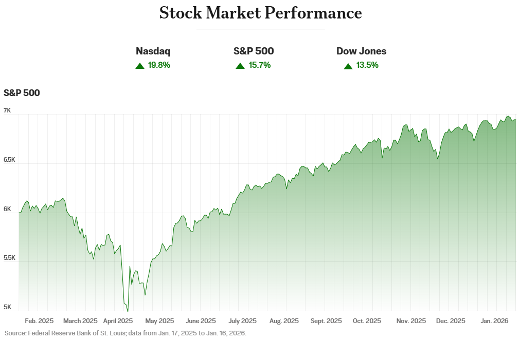 Kể từ khi Tổng thống Trump nhậm chức vào tháng 1 năm 2025, các chỉ số chứng khoán đã đạt mức cao kỷ lục. Chỉ số S&P 500 đã tăng gần 16% tính đến ngày 14 tháng 1, so với mức tăng 24% trong cùng kỳ nhiệm kỳ đầu tiên của ông Trump. Trong 12 tháng qua, chỉ số Dow Jones Industrial Average tăng 13% và chỉ số Nasdaq tăng 20%.