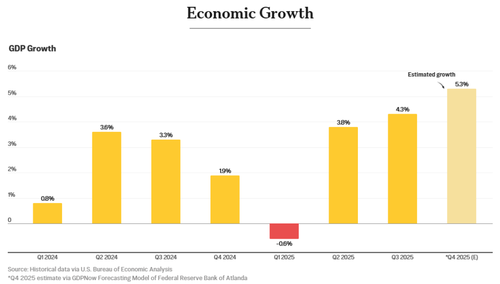 Sau khi giảm 0,6% trong quý đầu tiên, tăng trưởng kinh tế Mỹ đã tăng tốc và vượt quá dự báo của các nhà kinh tế trong năm 2025, tránh được nguy cơ suy thoái kinh tế như dự đoán. GDP tăng 3,8% trong quý 2 và 4,3% trong quý 3 – mức tăng trưởng mạnh nhất trong hai năm. Mặc dù dữ liệu chính thức cho giai đoạn từ tháng 10 năm 2025 đến tháng 12 năm 2025 vẫn chưa được công bố, Cục Dự trữ Liên bang Atlanta ước tính tăng trưởng ở mức khoảng 5%. Bộ trưởng Tài chính Scott Bessent dự đoán năm 2026 sẽ là một “năm bùng nổ”, với sự tăng trưởng kinh tế mạnh mẽ liên tục.