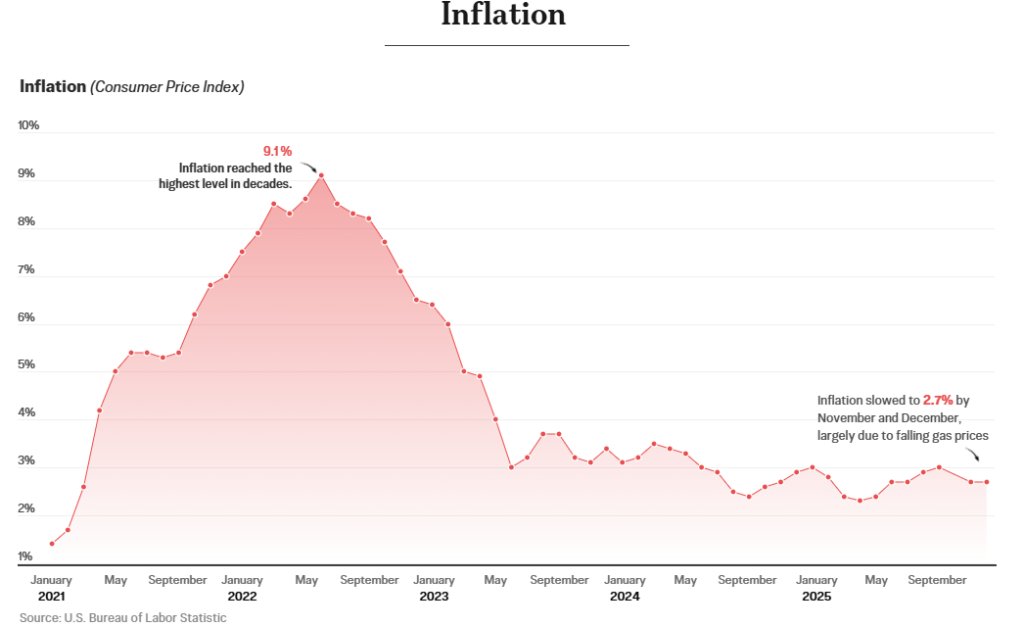 Lạm phát đạt mức 9,1% vào năm 2022, mức cao nhất trong nhiều thập kỷ. Mặc dù giá tiêu dùng vẫn ở mức cao trong suốt năm 2025, tỷ lệ lạm phát thấp hơn so với mức ghi nhận trong thời chính quyền Biden. Tỷ lệ lạm phát hàng năm bắt đầu năm 2025 ở mức 3%, giảm xuống 2,3% vào tháng 4 và tăng trở lại 3% năm tháng sau đó. Vào tháng 11 và tháng 12, áp lực giá cả giảm bớt, với tỷ lệ lạm phát 12 tháng giảm mạnh xuống 2,7%, chủ yếu nhờ giá xăng giảm.