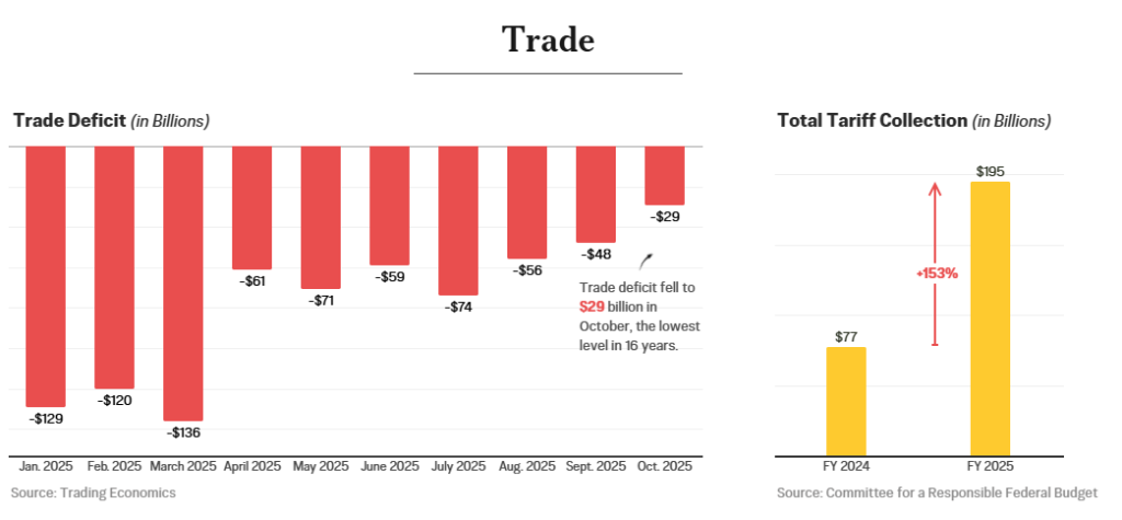 Mặc dù thâm hụt thương mại gia tăng trong ba tháng đầu năm 2025 do các doanh nghiệp tranh thủ mua hàng trước khi các chính sách thuế quan toàn cầu của Tổng thống Donald Trump được áp dụng, cán cân thương mại hàng tháng của Mỹ đã cải thiện đáng kể. Sau khi đạt đỉnh điểm ở mức 136 tỷ đô la, thâm hụt thương mại hàng hóa của Mỹ đã giảm xuống còn 29 tỷ đô la trong tháng 10 – mức thấp nhất trong 16 năm.
