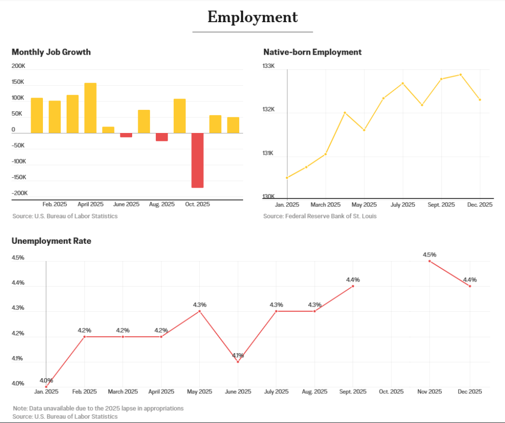 Kể từ mùa hè năm ngoái, thị trường lao động Hoa Kỳ được đặc trưng bởi điều mà một số nhà kinh tế gọi là “ít sa thải, ít tuyển dụng”, với việc các công ty không giảm cũng không mở rộng lực lượng lao động của mình. Năm 2025, các nhà tuyển dụng đã tạo thêm tổng cộng 584.000 việc làm, trung bình 49.000 việc làm mỗi tháng. Tuy nhiên, tốc độ tăng trưởng việc làm chậm lại khi biên chế khu vực công giảm 277.000, phản ánh nỗ lực của chính quyền nhằm thu hẹp bộ máy hành chính liên bang và hỗ trợ việc làm trong khu vực tư nhân.