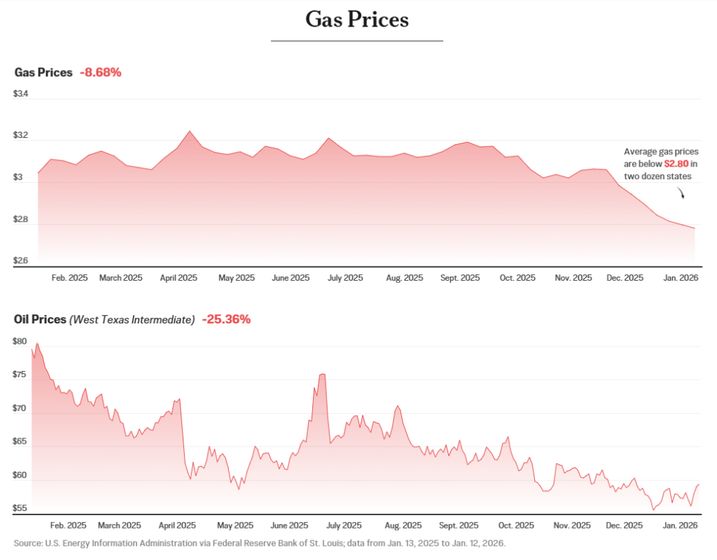 Một trong những thành tựu lớn của chính quyền Trump là sự sụt giảm đáng kể giá xăng dầu. Từ sản lượng kỷ lục đến việc nới lỏng các quy định, các doanh nghiệp và người tiêu dùng đã được hưởng lợi từ chi phí năng lượng thấp hơn. Giá dầu thô đang giao dịch dưới 60 đô la, trong khi giá xăng trung bình ở hai chục tiểu bang dưới 2,80 đô la một gallon. Các nhà phân tích thị trường dự đoán xu hướng này sẽ tiếp tục trong năm tới.