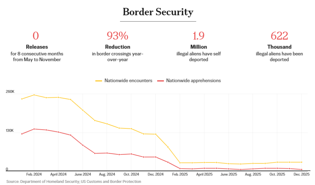 Tổng thống Donald Trump đã nhấn mạnh an ninh biên giới là ưu tiên chính sách hàng đầu. Bằng cách tăng cường an ninh biên giới, Hoa Kỳ đã giảm 93% số vụ vượt biên, 622.000 vụ trục xuất và 1,9 triệu vụ tự nguyện trục xuất. Điều này đạt được nhờ việc tăng cường nhân lực thực thi pháp luật và thắt chặt các thủ tục.