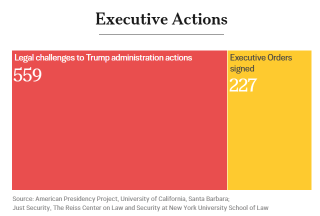 Mặc dù chính quyền đã giành được một thắng lợi lập pháp lớn với Đạo luật “Một Dự luật Tuyệt vời”, Tổng thống Donald Trump đã sử dụng quyền lực của nhánh hành pháp để thúc đẩy nhiều mục tiêu chính sách của mình, bao gồm cả thuế quan và các quy định. Một số trong hơn 220 sắc lệnh hành pháp đã được ký cũng vấp phải sự xem xét pháp lý từ các tổ chức vận động, công ty và tiểu bang, dẫn đến các cuộc tranh chấp đã lên đến Tòa án Tối cao.