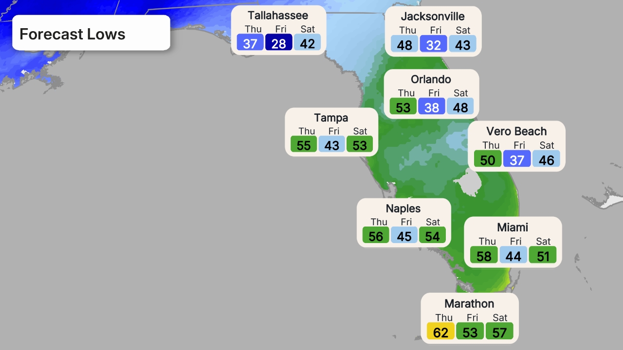 Khối khí lạnh sẽ tràn qua tiểu bang vào thứ Bảy, khiến gió mạnh và nhiệt độ giảm xuống đáng kể vào đêm thứ Bảy và sáng Chủ nhật. Thời tiết sẽ thực sự rất lạnh. Khối khí này đến từ vùng Bắc Cực của Canada, cách Nam Florida khoảng 4.000 dặm.