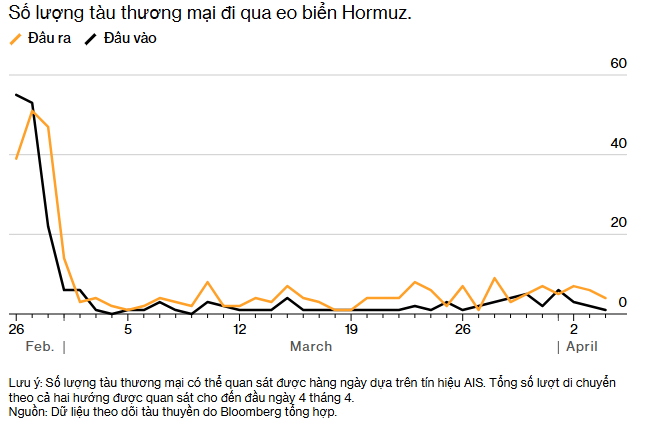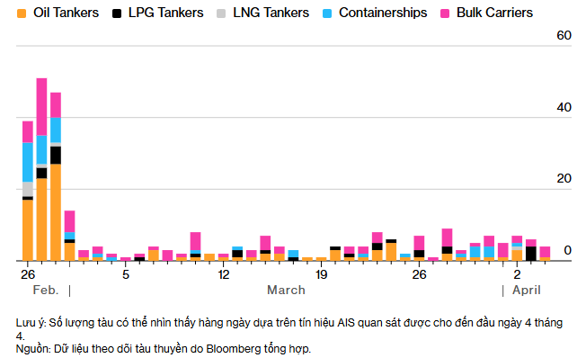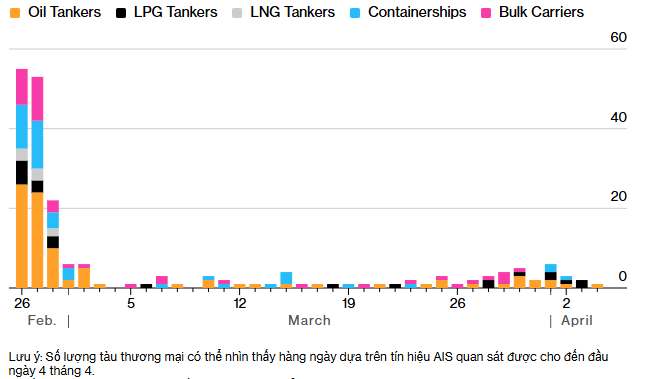 Lưu ý: Số lượng tàu thương mại có thể nhìn thấy hàng ngày dựa trên tín hiệu AIS quan sát được cho đến đầu ngày 4 tháng 4.