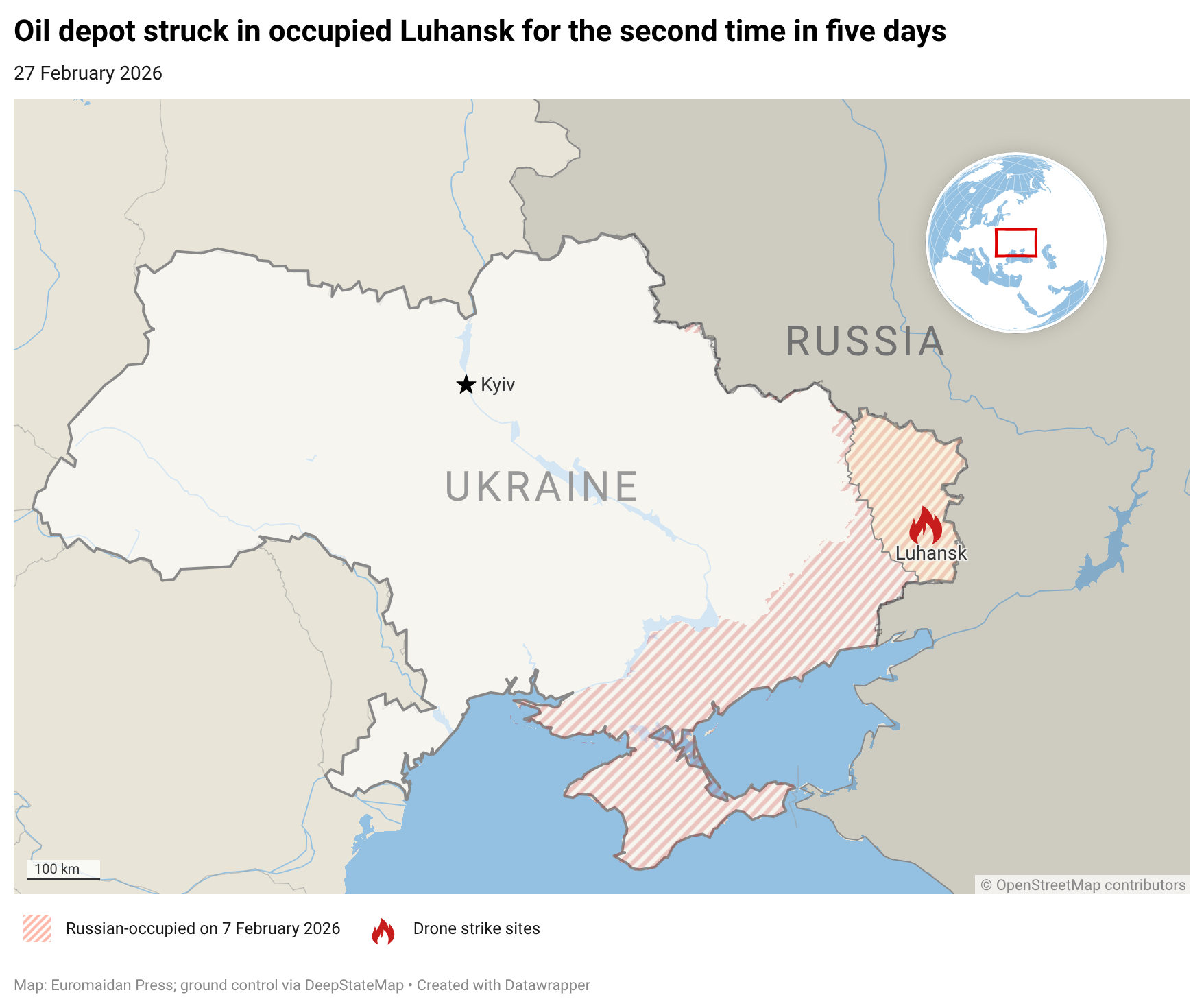 Lực lượng quốc phòng Ukraine đã tấn công một kho dầu của quân đội Nga ở Luhansk, khu vực bị chiếm đóng, vào đêm ngày 27 tháng 2, gây ra một vụ hỏa hoạn lớn tại cơ sở này lần thứ hai trong vòng năm ngày, theo báo cáo của Bộ Tổng tham mưu và Lực lượng Hệ thống Không người lái . Bộ Tổng tham mưu Ukraine cho biết thêm, cùng đêm đó, quân đội cũng đã tấn công các kho nhiên liệu ở khu vực bị chiếm đóng của tỉnh Donetsk gần Mariupol, Novotoretske và Koptieve, cũng như một điểm kiểm soát máy bay không người lái của Nga gần Raiske ở tỉnh Kherson bị chiếm đóng.Chiến dịch sử dụng máy bay không người lái kéo dài của Ukraine nhằm vào cơ sở hạ tầng nhiên liệu của Nga đã làm suy giảm đáng kể năng lực lọc dầu của Nga, với các cuộc tấn công vươn xa tới 1.700 km vào lãnh thổ Nga. Tại các khu vực bị chiếm đóng của Ukraine, máy bay không người lái của Kyiv đã liên tục tấn công các kho nhiên liệu từ